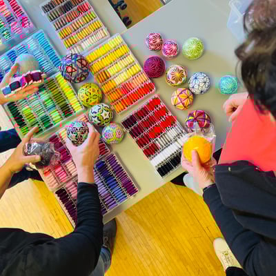 So habe ich in der KVH in einem 2 tägigen Anfänger-Kurs zwei Temari-Kugeln angefertigt und anschließend mit zwei unterschiedlichen Mustern bestickt. Zum Einstieg lernten wir das Schildkröten-Muster und dann das etwas anspruchsvollere Chrysantheme-Muster, ich bin begeistert wie gut es uns allen gelungen ist. Wir hatten viel Spaß in der Gruppe, das war definitiv ein Erfolgserlebnis!