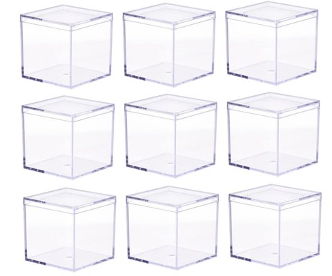 Diese Acrylboxen (Bild links) messen 8,5 cm mal 8,5 cm.